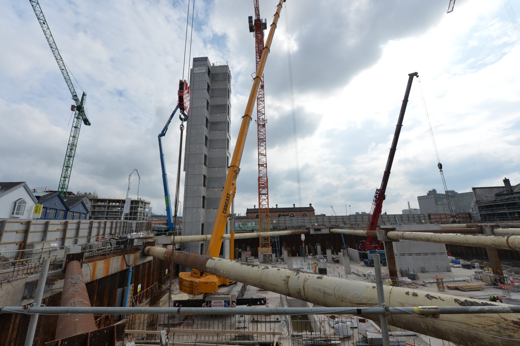Already, and before the first anniversary of lodging for planning approval, the full double basement has been excavated, and the first of five cores for the two buildings is erected, dramatically visible from many city angles, including as a significant anchor bookending MacCurtain St.